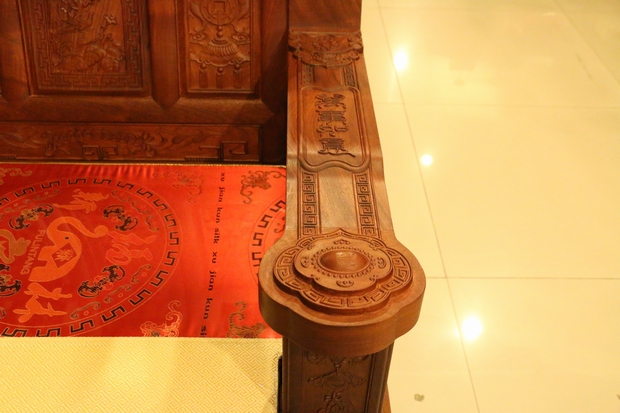 說完了背板,我們再來看看沙發的兩處扶手,在扶手上方的正中位置,雕繪有四個很清晰的字眼:萬事如意,字體仍是采用的古漢字字體,其筆畫彎延有致,筆鋒靈動飄逸,頗具藝術美感氣息,令人陶醉。而在其扶手末端之位置處,則是一分三層雕刻設計的立體紋飾圖案,用手輕撫摸之,層次立體感及舒適感十分明顯。另在扶手的外部側面處則還形象地雕繪有一框花籃,花籃內花團齊簇,顯得十分美艷,富貴華麗。